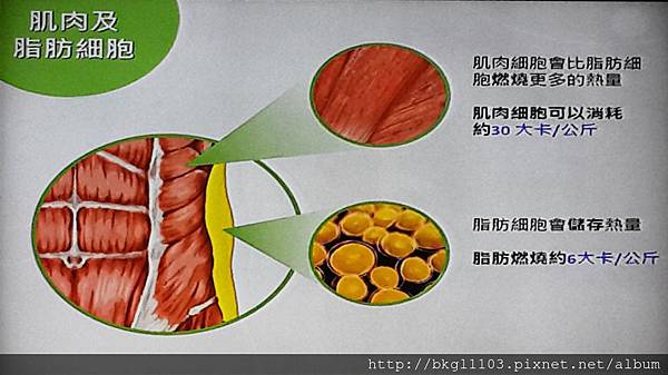 肌肉細胞會比脂肪細胞燃燒更多的熱量,肌肉細胞可以消耗約30大卡/公斤,脂肪細胞會儲存熱量,脂肪燃燒約6大卡/公斤。