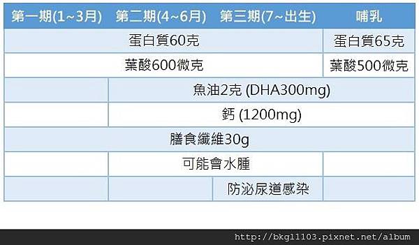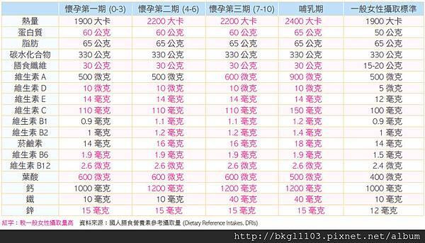 從這張圖我們可以看到懷孕第一期、第二期、第三期、哺乳期甚至一般女性每日需要攝取的營養都寫在上面了!所以同學們可以下課了(漂走~~~)