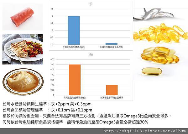 至於安全性來講,補魚油比吃魚肉還安全,原因如下圖~同時美國FDA在許多年前就建議大家不要食用四種深海大型魚Sword Fish(劍旗魚)、Shark(鯊魚)、King Mackerel(大耳馬鮫)、Tilefish(軟棘魚)。因在海中的食物鏈頂層,生物累積效應,重金屬含量較高!