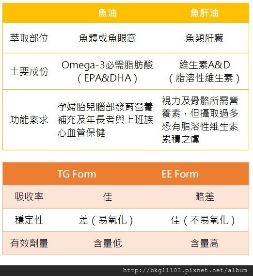至於魚油跟魚肝油的差別,與TG&EE 型態我做圖給大家比較如下,真正好的魚油營養品公司會自行研發,並經過人體臨床實驗,追求TG與EE FORM最佳混合比例方便人體吸收!