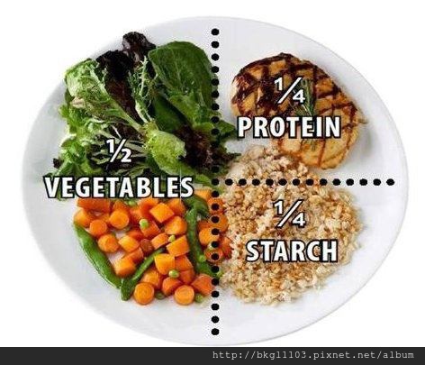 以一個盤子來看,1/2是蔬菜水果,1/4是蛋白質,1/4是澱粉組成!