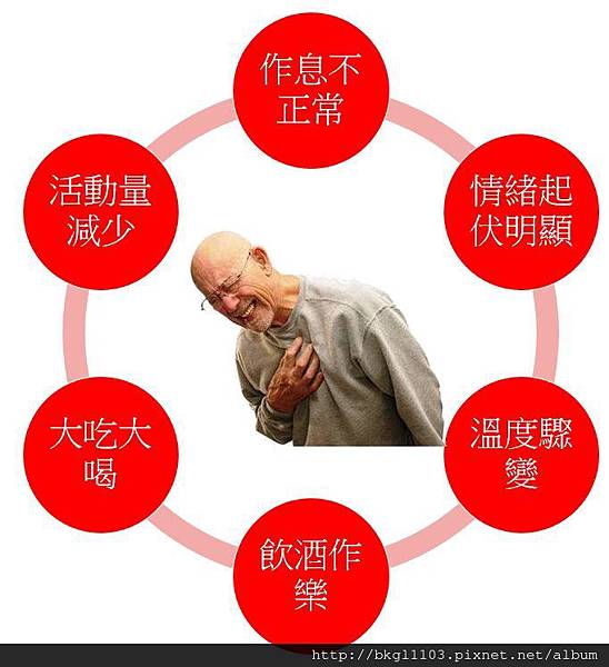- 腸胃道疾病者,減少食用太過重口味的食品,如酒、濃茶、咖啡、辛辣物。太過 油膩 以及 難消化 的食物(如:年糕、油飯等)也會加重腸胃負擔,需減少攝取。