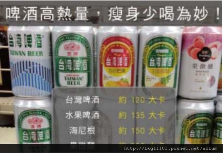 - 各種酒類熱量皆不低,以酒精濃度3.5%的啤酒1罐(360c.c.)而言,熱量就有180大卡。建議可多選購無糖茶類取代酒品。